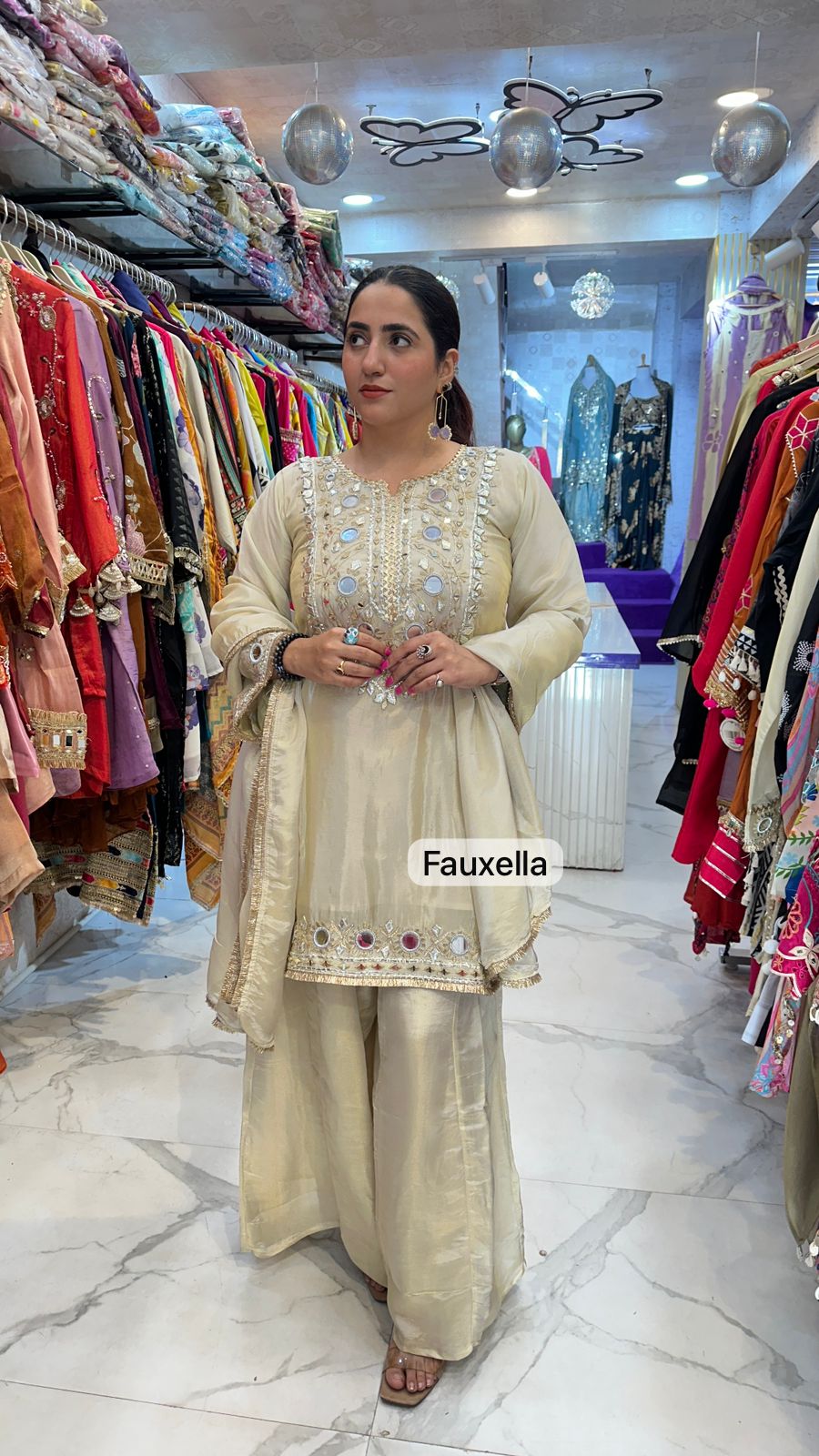 The "GULFAAM" suit showcases exquisite front mirror work paired with an intricately designed heavy neck, creating a striking and elegant ensemble. Perfect for special occasions, this suit combines traditional craftsmanship with a contemporary silhouette to elevate your wardrobe with a refined, sophisticated look.