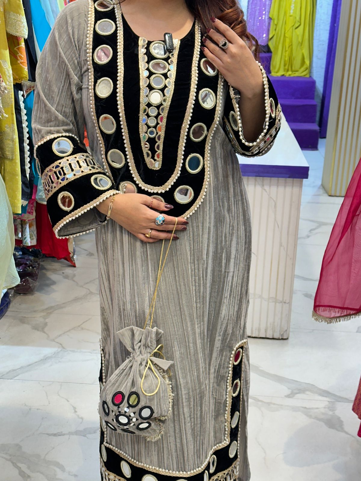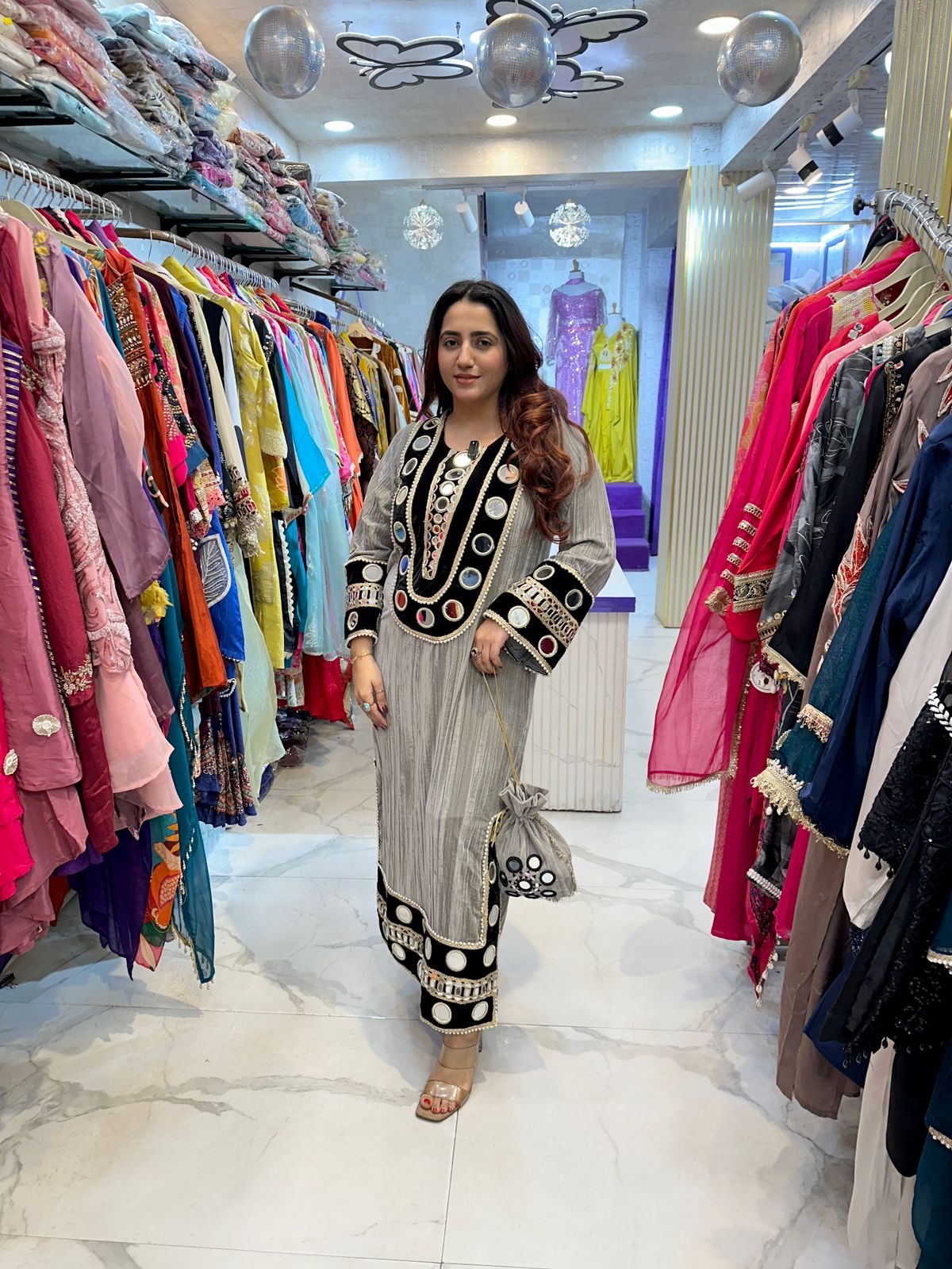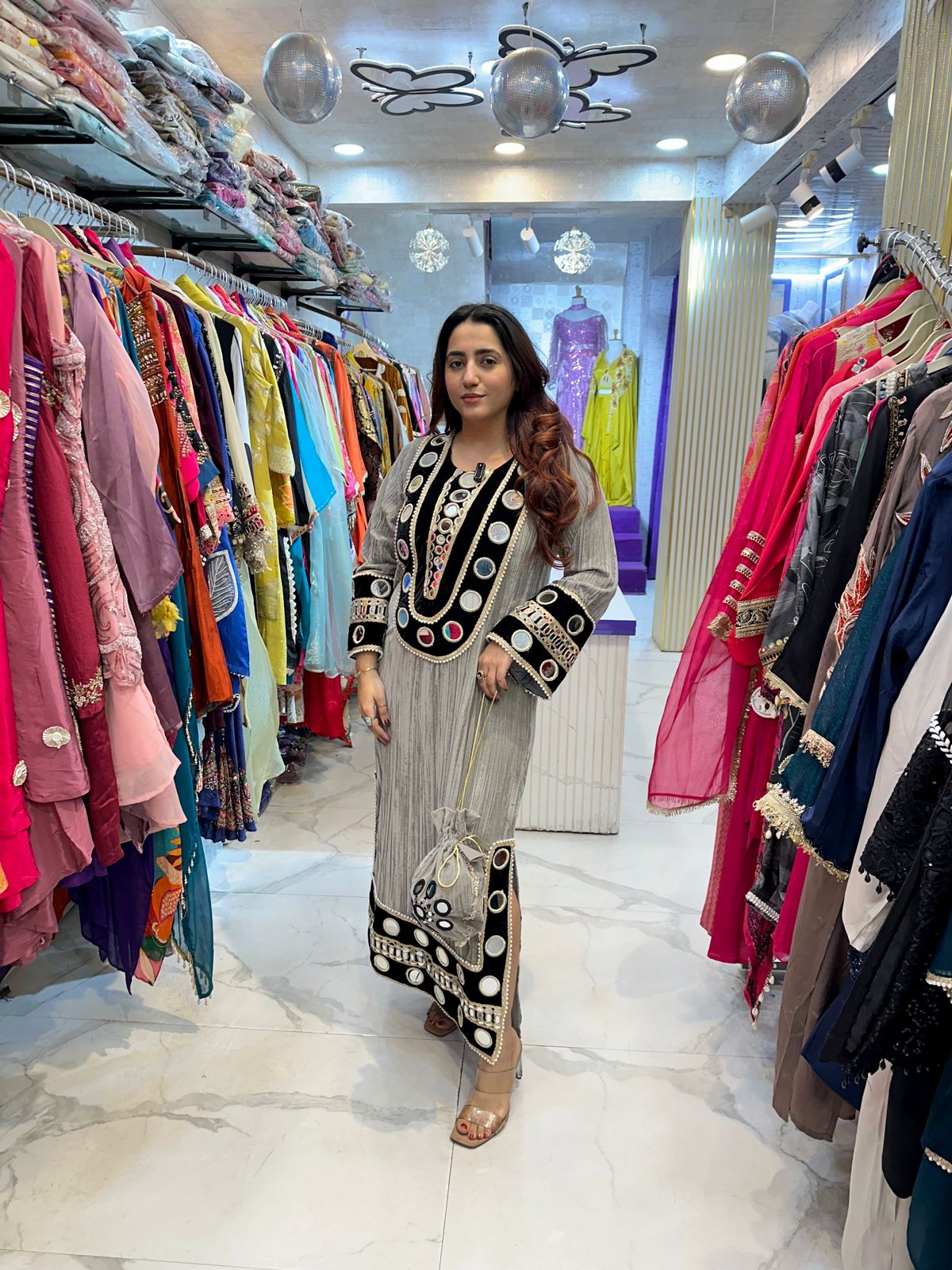 The TAJ Grey Phiran combines traditional craftsmanship with understated elegance. This versatile garment features a sophisticated grey palette and includes a matching potli, making it ideal for both casual wear and festive occasions. The phiran's relaxed silhouette offers comfort without compromising on style, while the intricate detailing reflects authentic artisanal work. Perfect for those seeking timeless pieces that bridge cultural heritage and contemporary fashion.